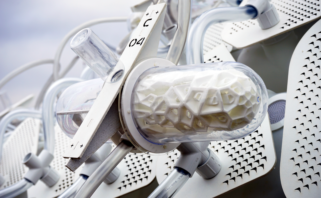Cricket Shelter is a self-sufficient, interconnected array of structural pods that fosters an optimal environment for supporting the life cycle of crickets. The embedded ecosystem was developed to permeate the structural system, each independent module linked by tubes connecting the elements to render the crickets “free-range”. Whereas in many parts of the world entomophagy is more common but contamination is more likely, Cricket Shelter’s innovative process offers a sanitary and hygienic solution.