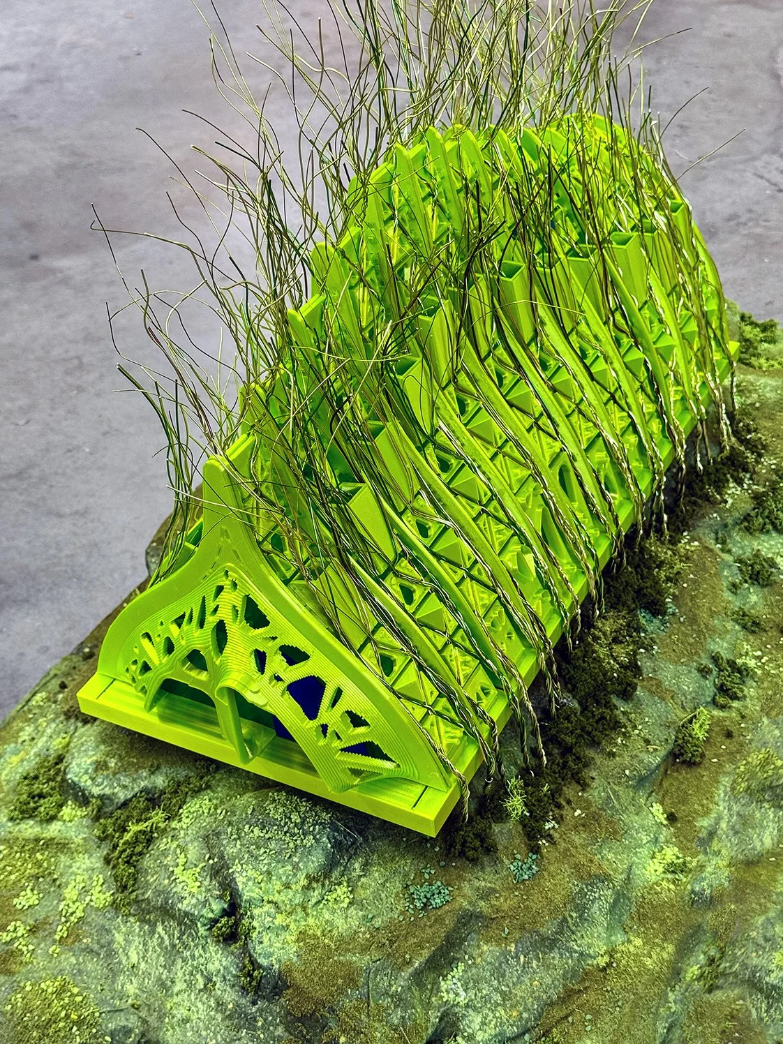 In the face of extreme climate events, this project leverages the self-healing and ecologically responsive characteristics of biological systems. Drawing from the Living Root Bridges of Meghalaya, India, we consciously chose to compose with elements such as scaffolding and woody plants as alternatives to emissions-heavy defaults like concrete, glass, and steel. Unlike indigenous precursors, we advanced computational methods of shaping pre-grown biomass. Individual elements are tunable and can be switched out as we gauge their success.